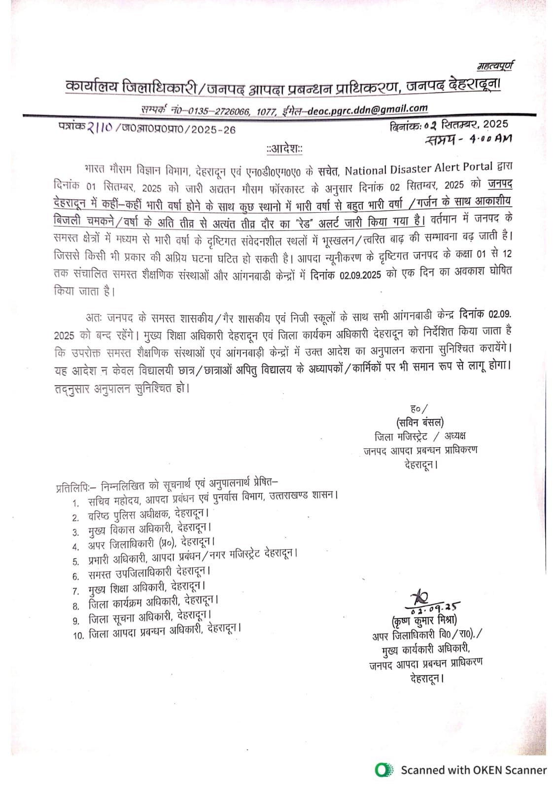 देहरादून : भारत मौसम विज्ञान विभाग और नेशनल डिज़ास्टर अलर्ट पोर्टल की चेतावनी के बाद देहरादून जिले में आज 2 सितम्बर को सभी शासकीय, गैर-शासकीय विद्यालयों और आंगनबाड़ी केंद्रों में अवकाश घोषित किया गया है।