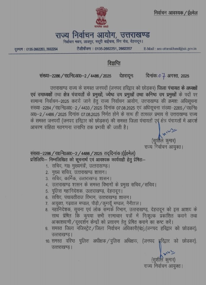 देहरादून : राज्य निर्वाचन आयोग, उत्तराखंड ने जिला पंचायत अध्यक्ष व उपाध्यक्ष सहित क्षेत्र पंचायत प्रमुख, ज्येष्ठ उप प्रमुख व कनिष्ठ उप प्रमुख के निर्वाचन-2025 की घोषणा कर दी है। साथ ही प्रदेश के सभी जनपदों (हरिद्वार को छोड़कर) में आज से ही आदर्श आचरण संहिता लागू कर दी गई है, जो मतगणना समाप्ति तक प्रभावी रहेगी।