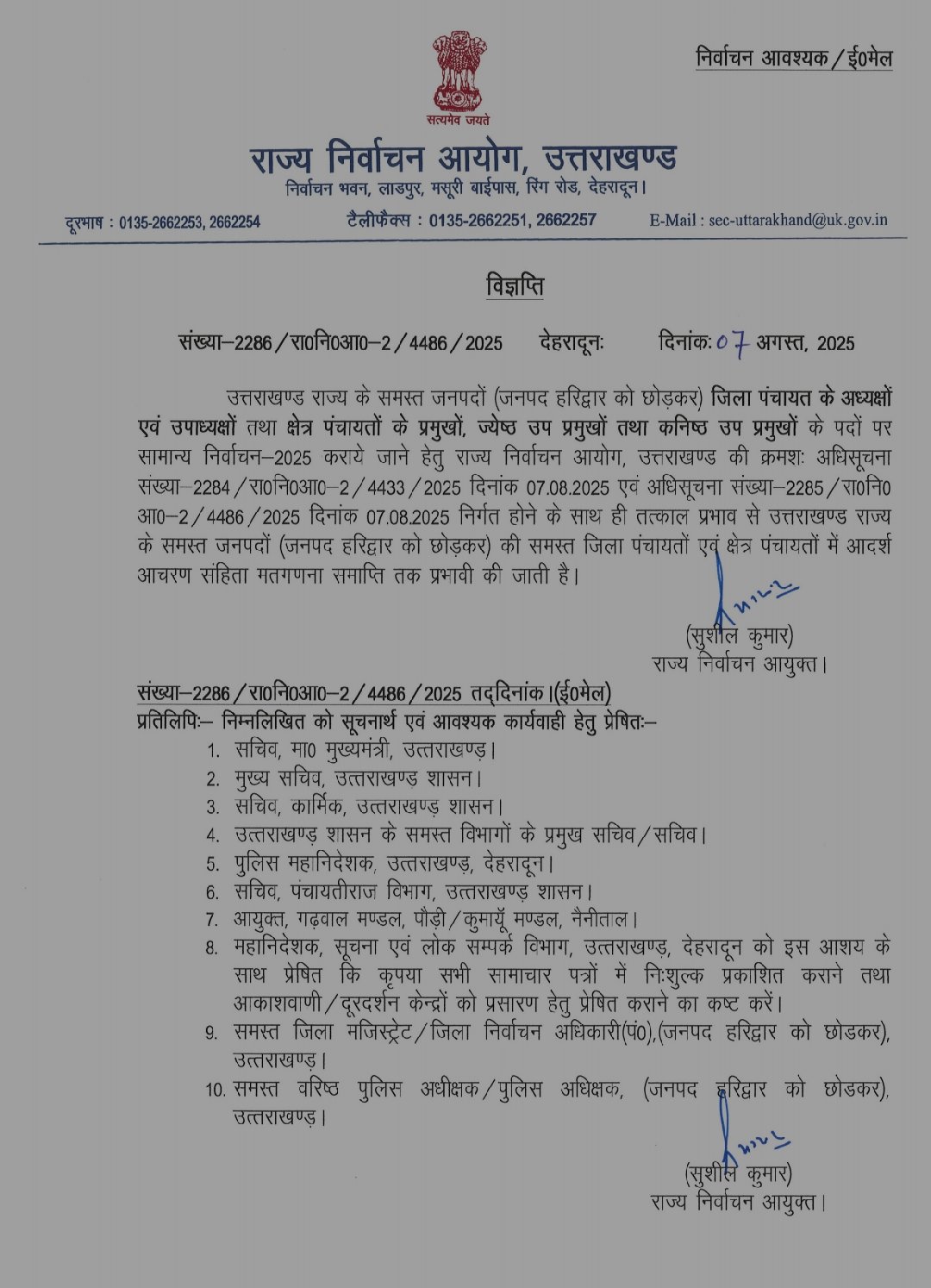 निर्वाचन आयोग की अधिसूचना संख्या-2286/रा०नि०आ०-2/4486/2025 के अनुसार, चुनाव कार्यक्रम के लिए 7 अगस्त को दो अधिसूचनाएं जारी की गईं: