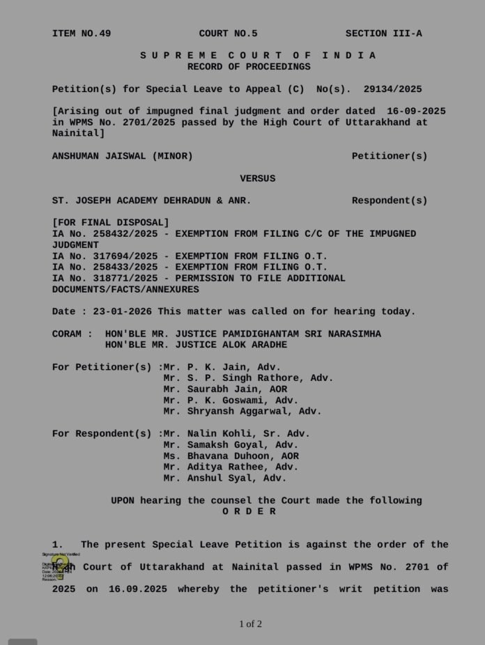 देहरादून : देहरादून के प्रतिष्ठित सेंट जोसेफ स्कूल के प्रबंधन की मनमानी पर सुप्रीम कोर्ट ने करारा अंकुश लगाते हुए छात्र अंशुमान जायसवाल के पक्ष में ऐतिहासिक फैसला सुनाया है। शीर्ष अदालत ने स्पष्ट किया है कि छात्र को 11वीं कक्षा में विज्ञान संकाय में ही पढ़ाई जारी रखने और परीक्षा में बैठने की अनुमति दी जाए।
