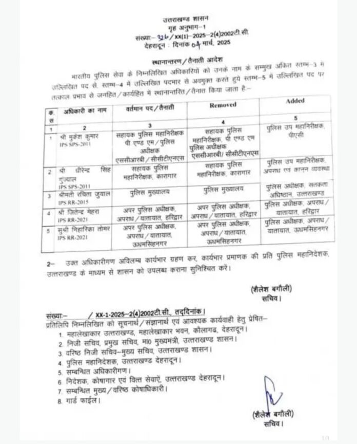 देहरादून : उत्तराखंड सरकार ने भारतीय पुलिस सेवा (IPS) के कई वरिष्ठ अधिकारियों के तबादले कर दिए हैं। गृह विभाग द्वारा जारी आदेश के तहत पुलिस महकमे में महत्वपूर्ण पदों पर फेरबदल किया गया है।
