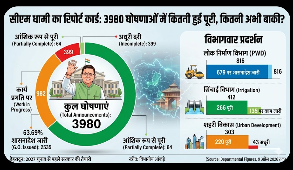 4 जुलाई 2021 को मुख्यमंत्री पद संभालने के बाद से 9 अप्रैल 2026 तक सीएम धामी ने कुल 3980 घोषणाएं की हैं।