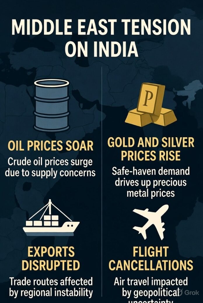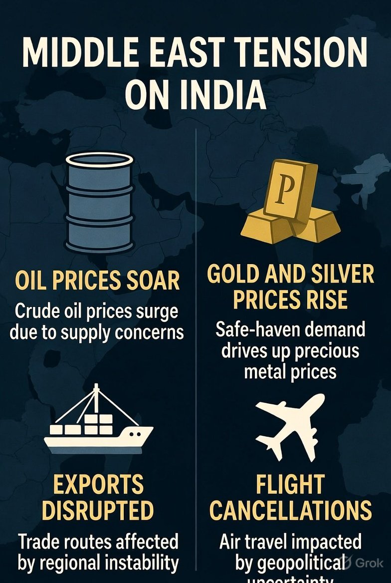 नई दिल्ली: अमेरिका और इज़राइल द्वारा ईरान पर किए गए बड़े हमलों और ईरान की जवाबी कार्रवाई के बाद मिडिल ईस्ट में युद्ध जैसी स्थिति बन गई है। इस संकट का सीधा असर भारत पर पड़ रहा है, जहां ऊर्जा आयात, कीमतें, निर्यात और हवाई यात्रा सभी प्रभावित हो रहे हैं। विशेषज्ञों का कहना है कि अगर स्थिति और बिगड़ती है, तो भारत की अर्थव्यवस्था पर बड़ा झटका लग सकता है।